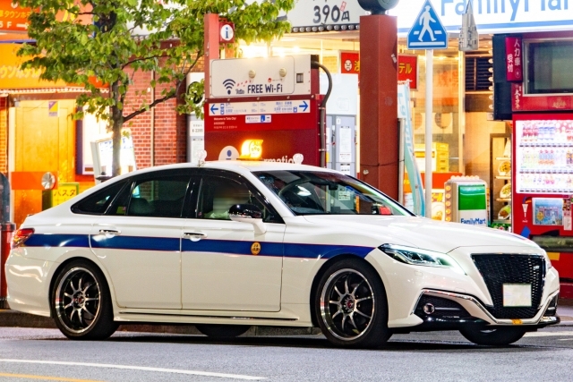 最近主流になっている黒のミニバンタクシーではなく、個人タクシーの黄色の行灯(三ッ星)を屋根に載せた白のトヨタ・クラウン。