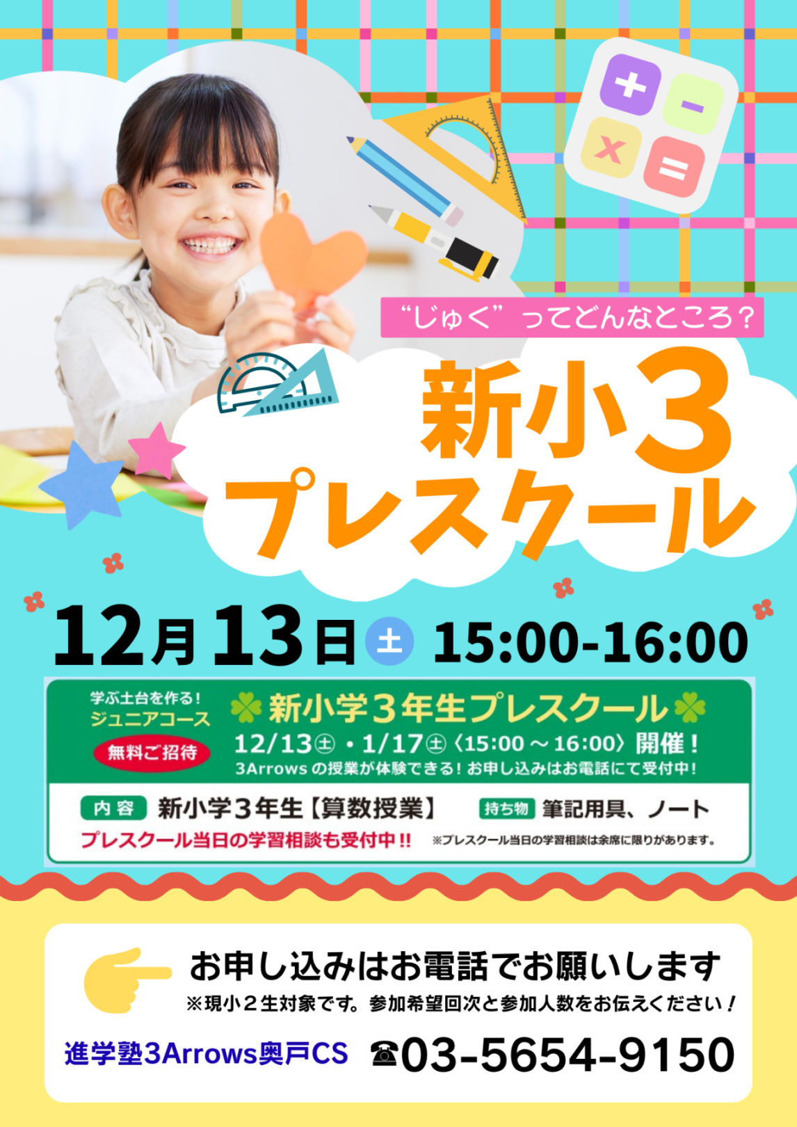 ●進学塾3Arrows奥戸CSの「小3ジュニアコース」